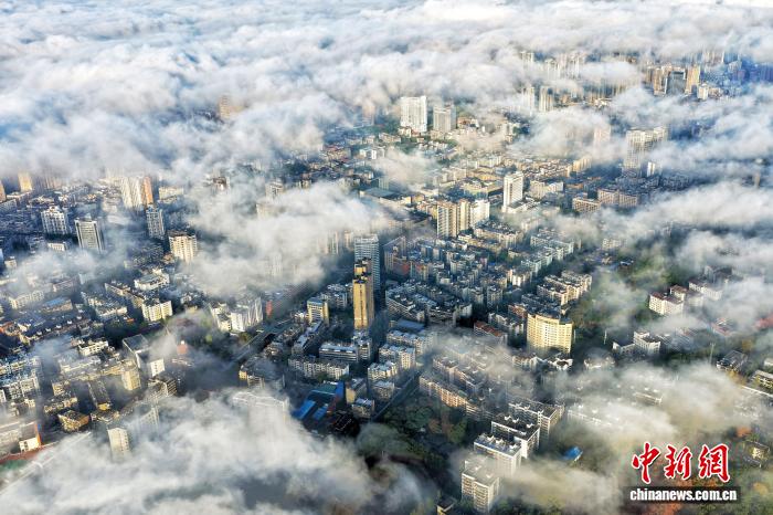 图为乡市正在浓雾中一目了然(无人机图片)。周星明 摄